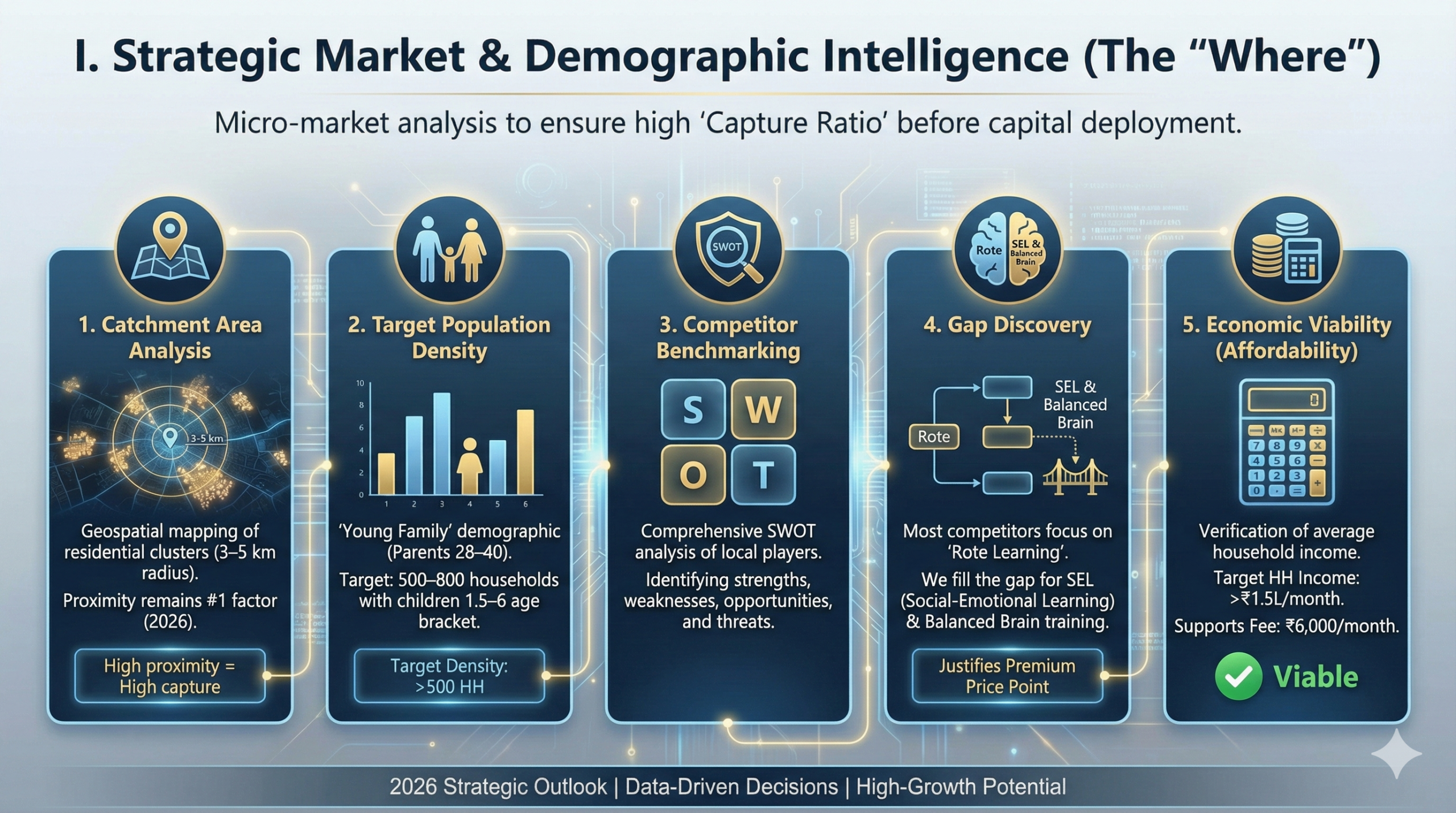 Before capital deployment, we conduct a granular analysis of the micro-market to ensure a high ‘Capture Ratio’ of the target audience.