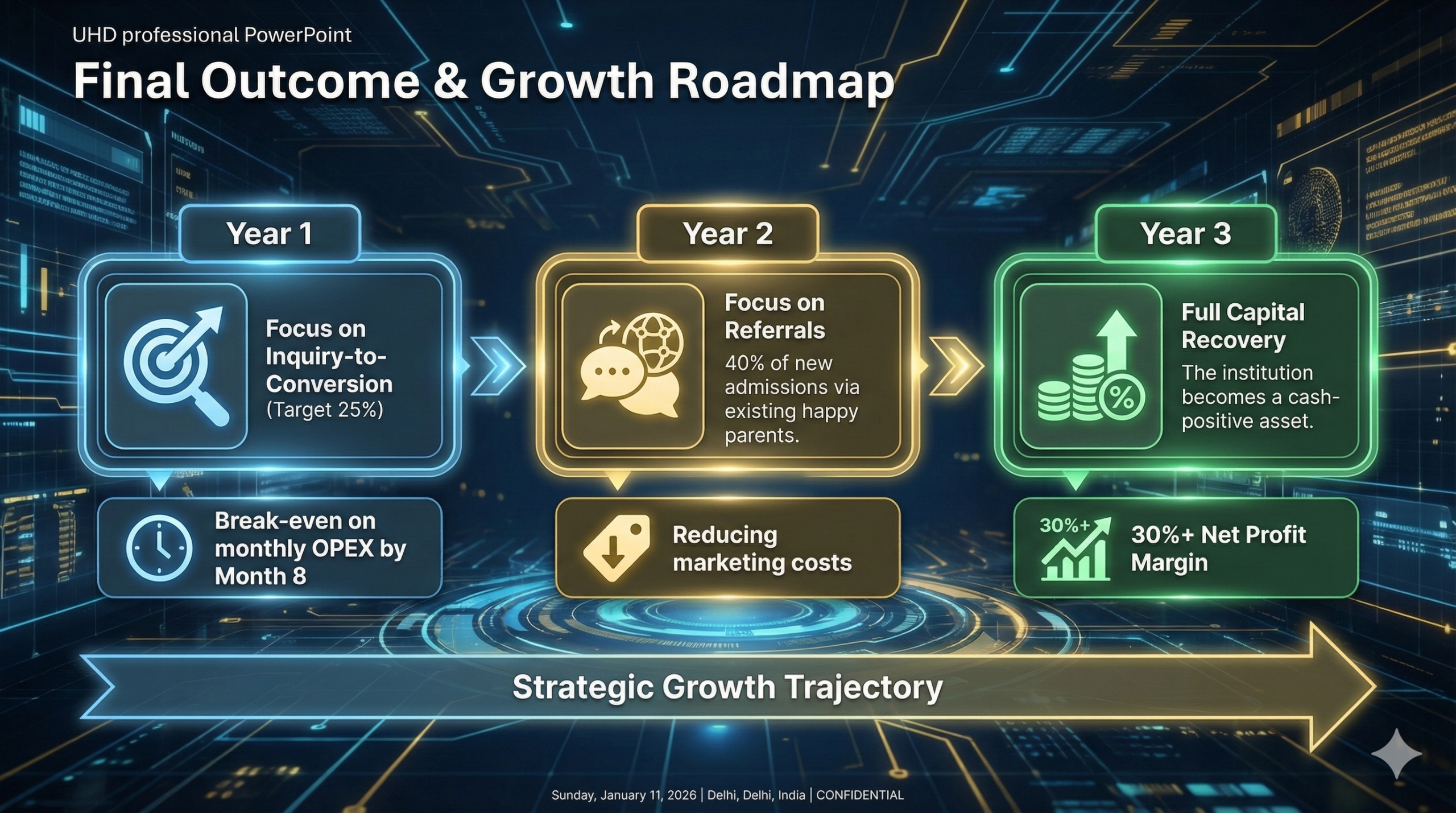 Year 3: Full Capital Recovery. The institution becomes a cash-positive asset with a 30%+ Net Profit Margin.