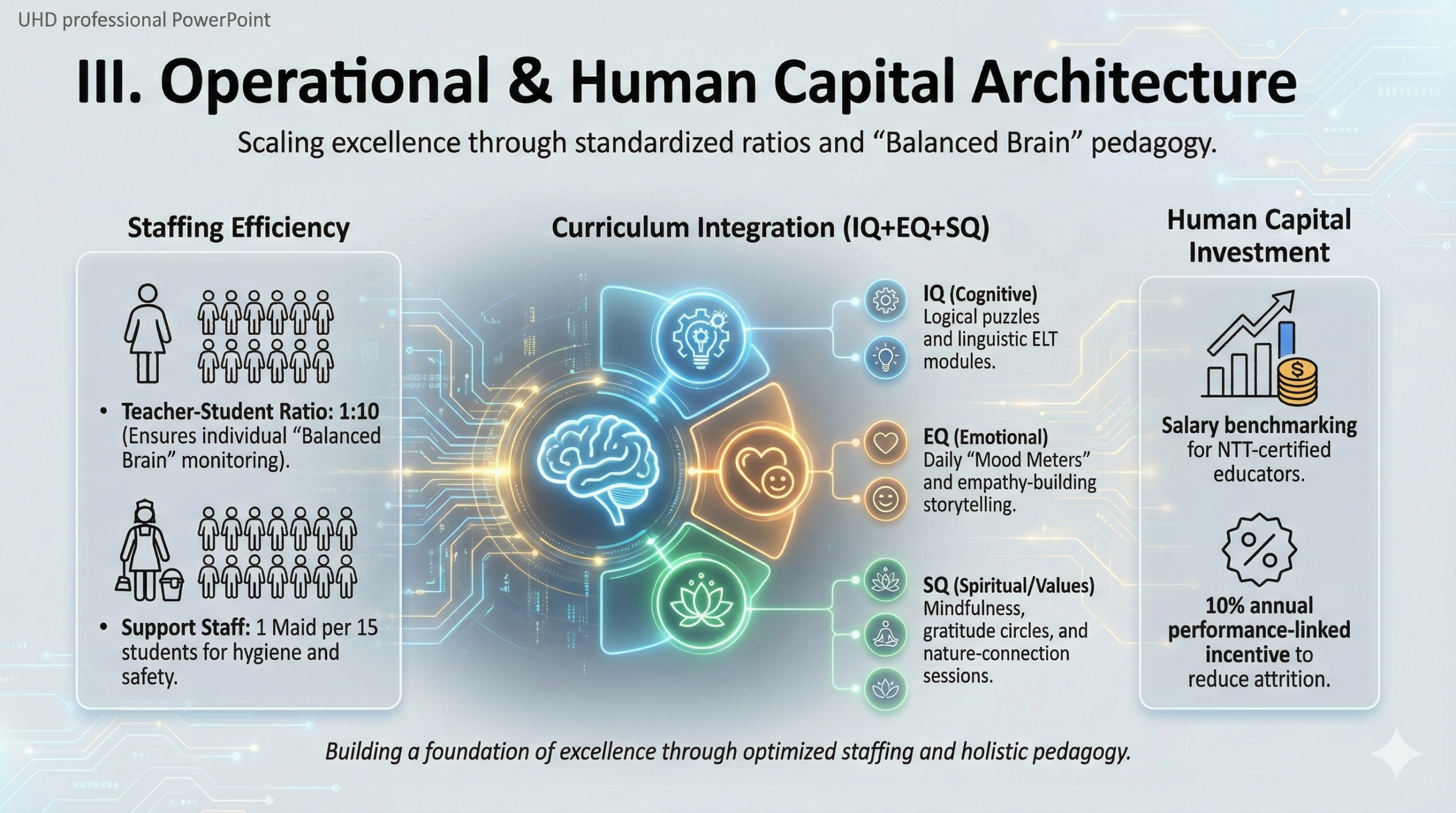 Staffing Efficiency: * Teacher-Student Ratio: 1:10 (To ensure individual “Balanced Brain” monitoring).