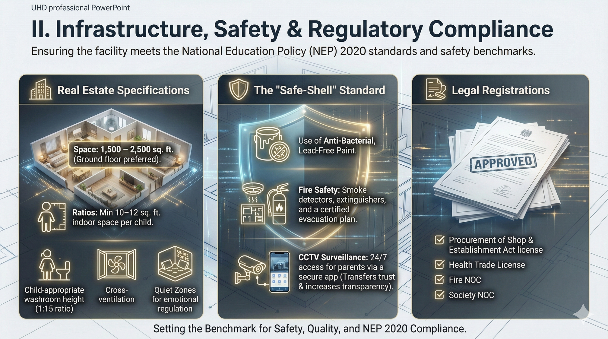 Ensuring the facility meets the National Education Policy (NEP) 2020 standards and safety benchmarks.